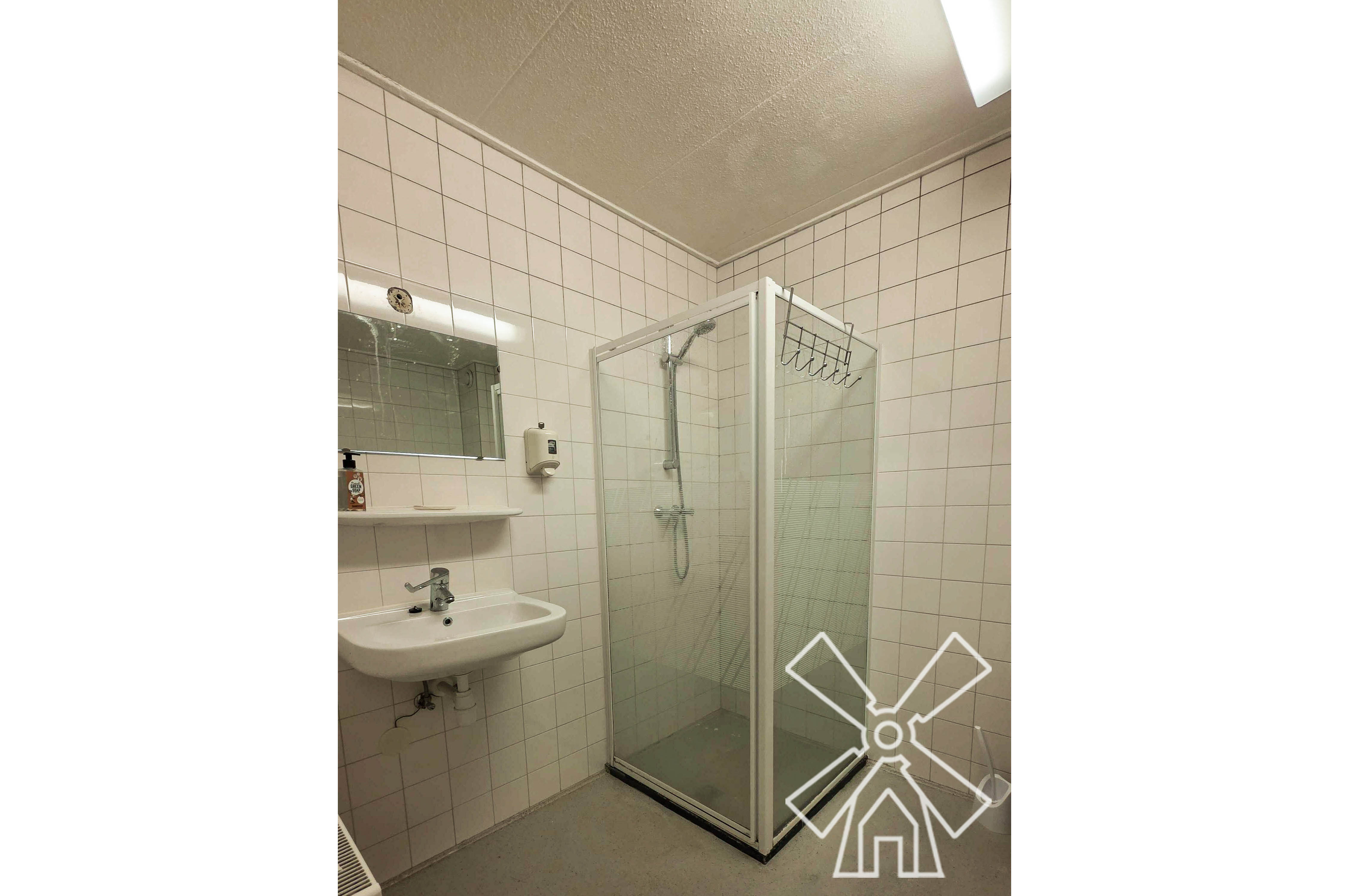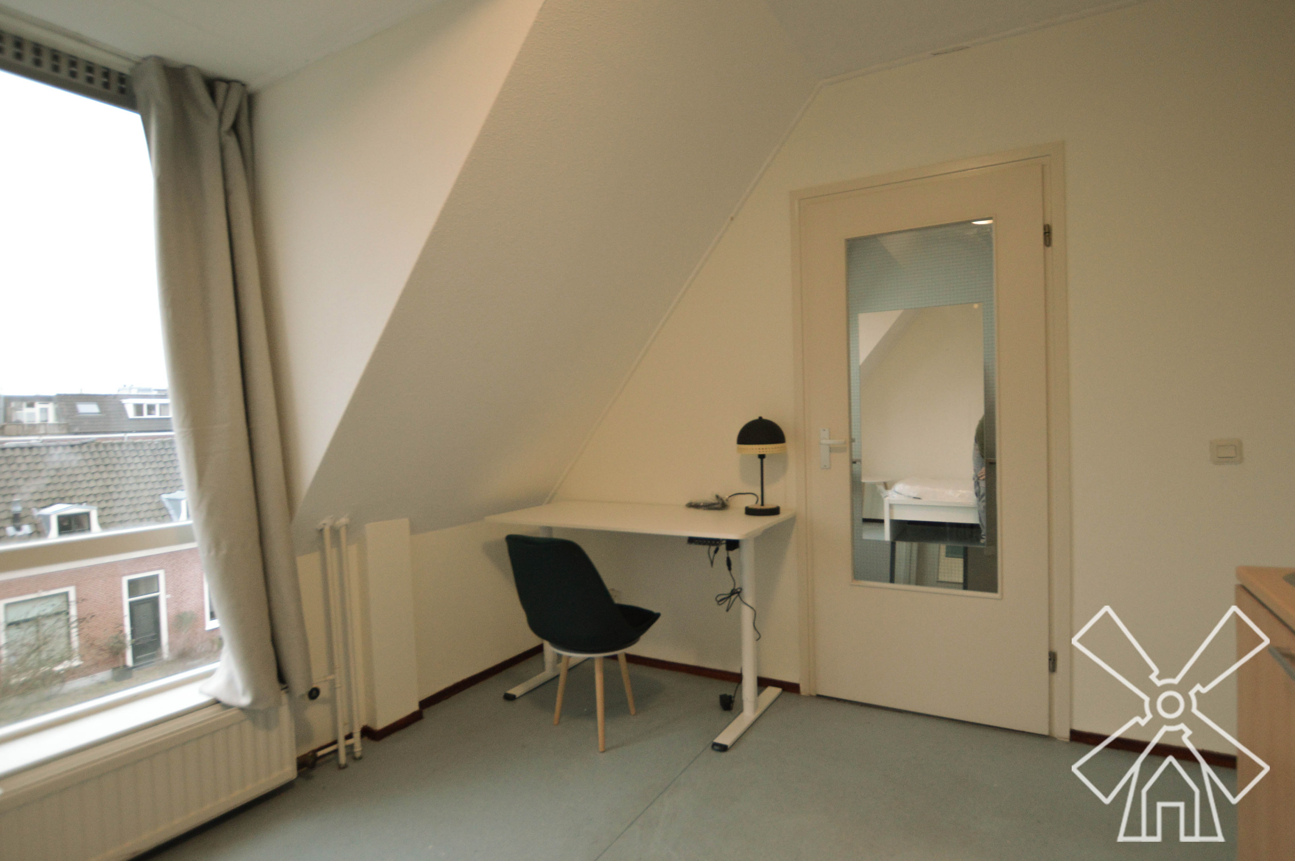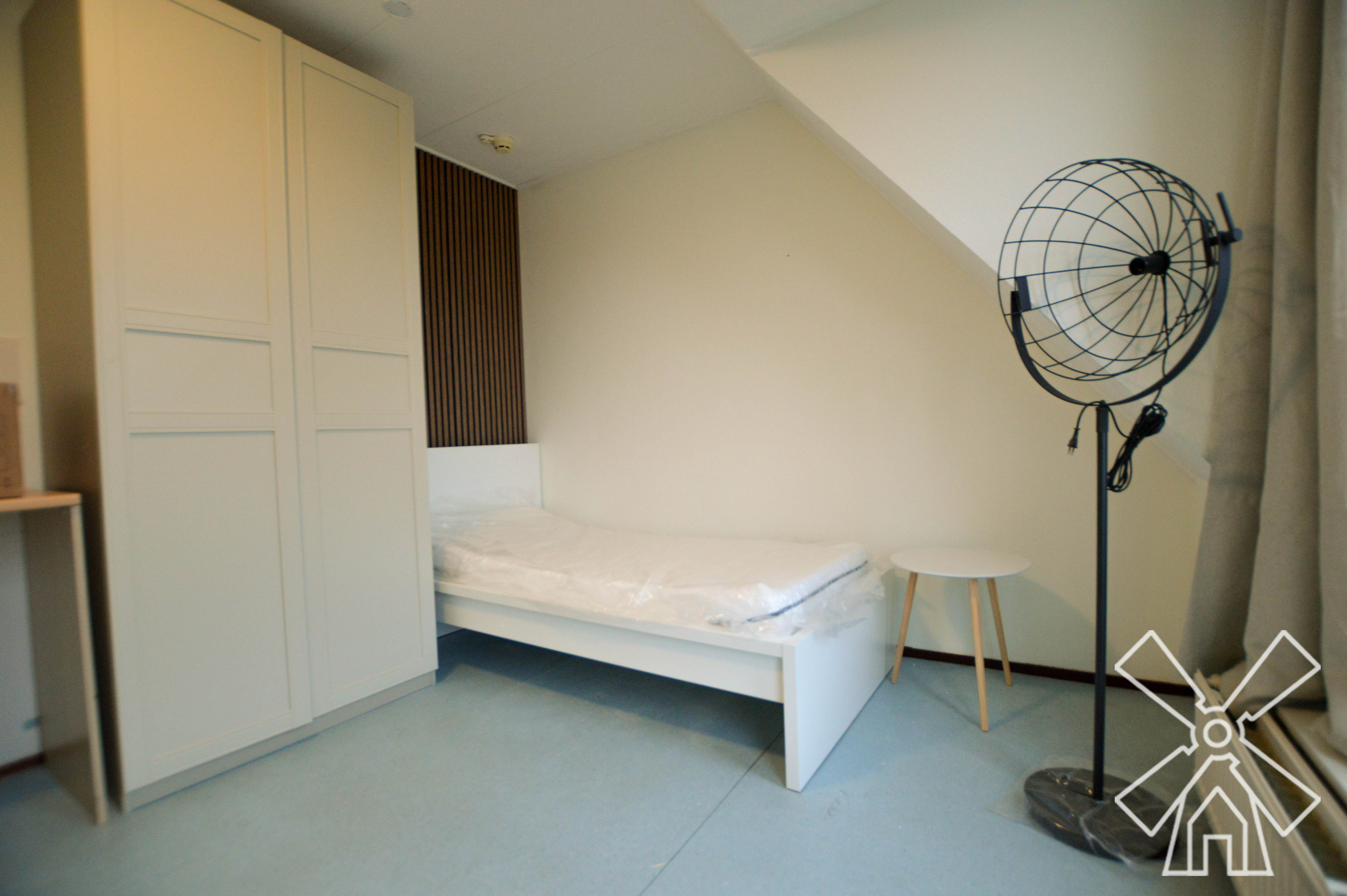 This accommodation features a slanted ceiling and light gray flooring, furnished with a single bed, a two-door wardrobe, a desk with an office chair, and a small side table. More features include a desk lamp, a floor fan, and a radiator installed below large windows with curtains. The compact utility area includes a cabinet with a stainless steel sink and countertop, a microwave, and a wardrobe. Sections of vertical wooden slats are visible behind the bed. In addition, the bathroom features white tiled walls, a glass-enclosed shower, a toilet, and a sink.