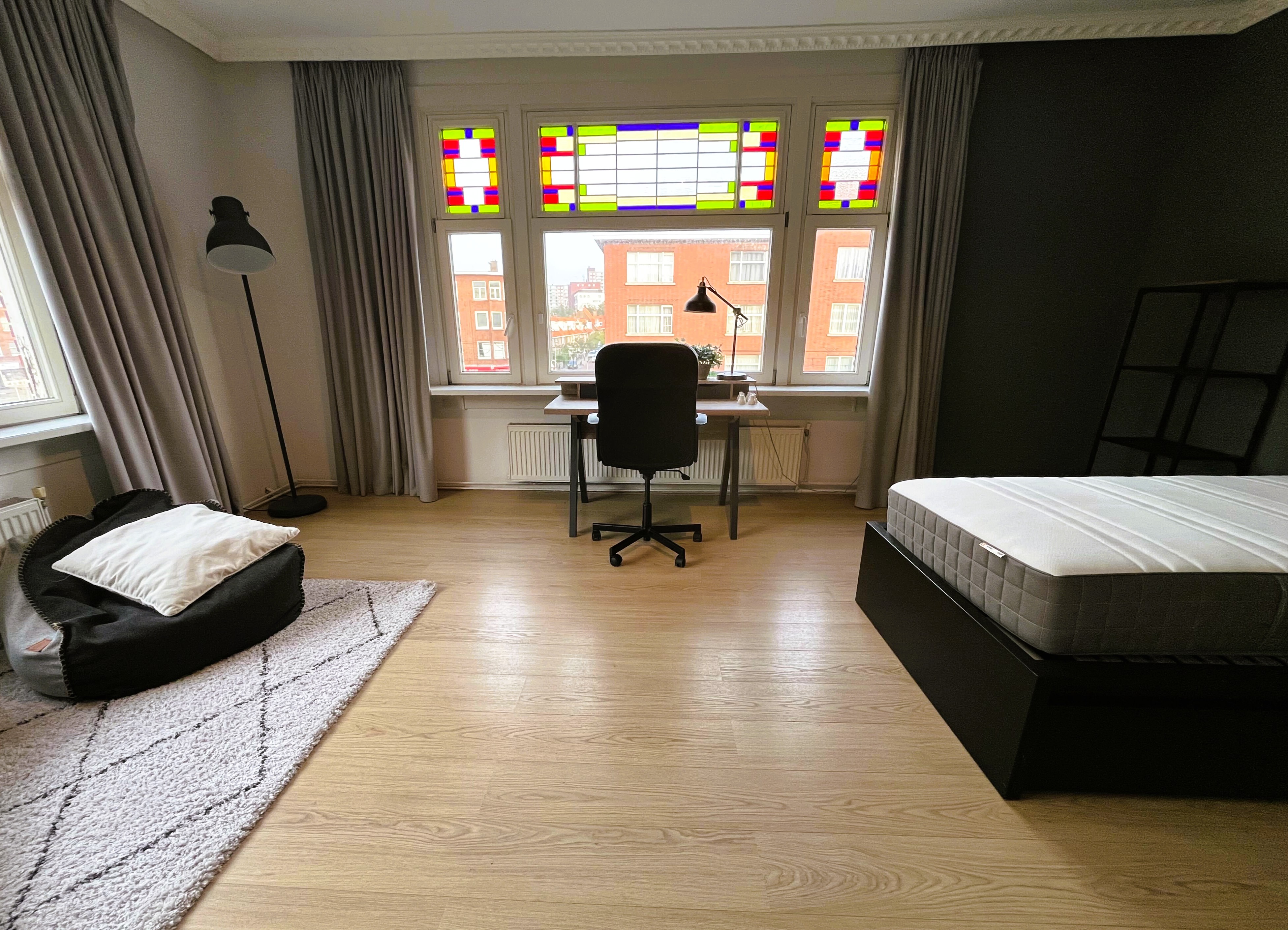 This bedroom is part of a spacious apartment on the 2nd floor, with the whole place covering 100m2. The bedroom is furnished with a single bed, built-in closet, desk, desk chair, desk lamp, shelf, floor lamp, and a bean bag for relaxation. You'll share the common area with two other tenants. There's a spacious living room where you can hang out with your roommates, complete with extra desks, a dining table and chairs, and bean bags for added comfort.