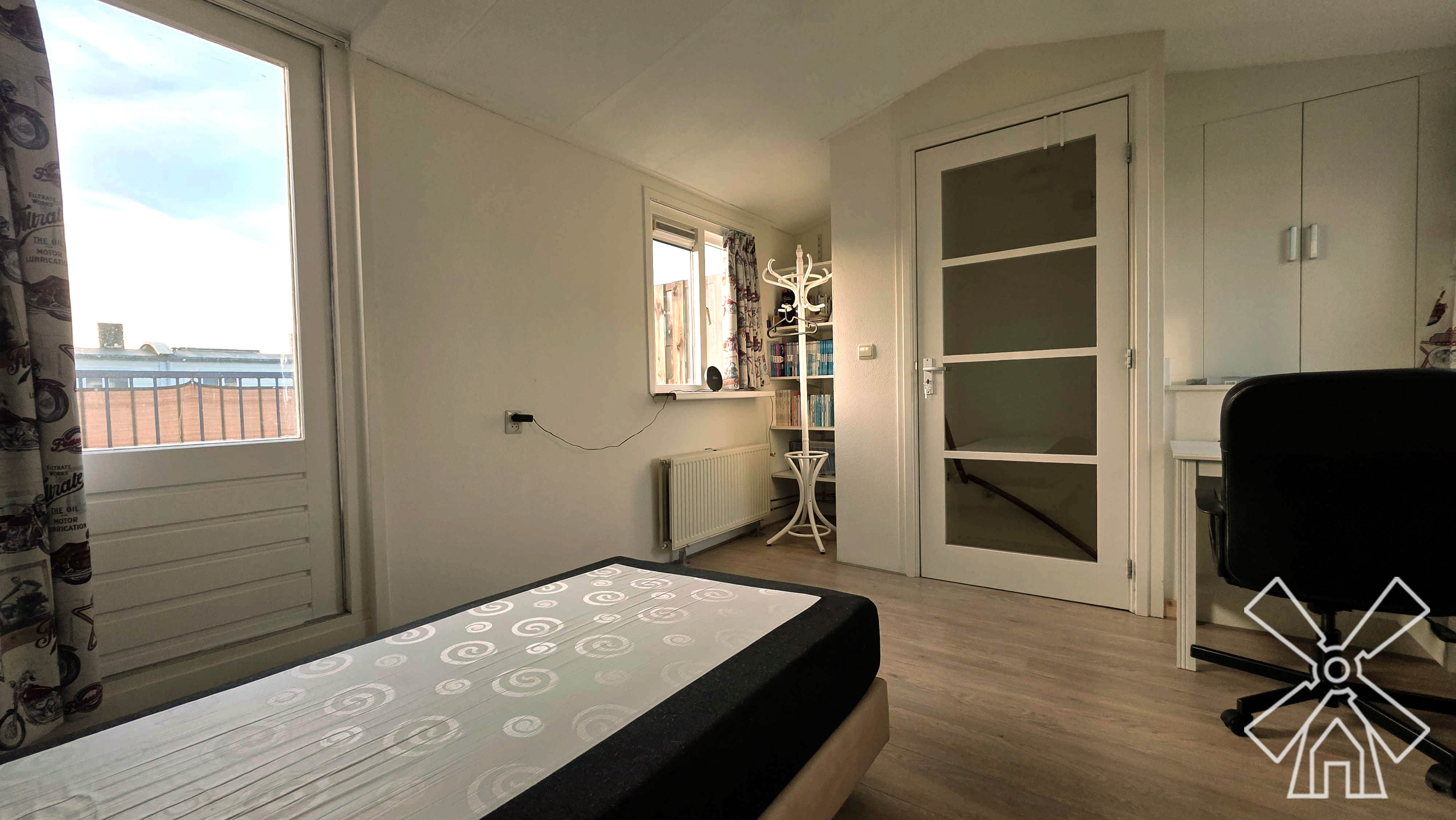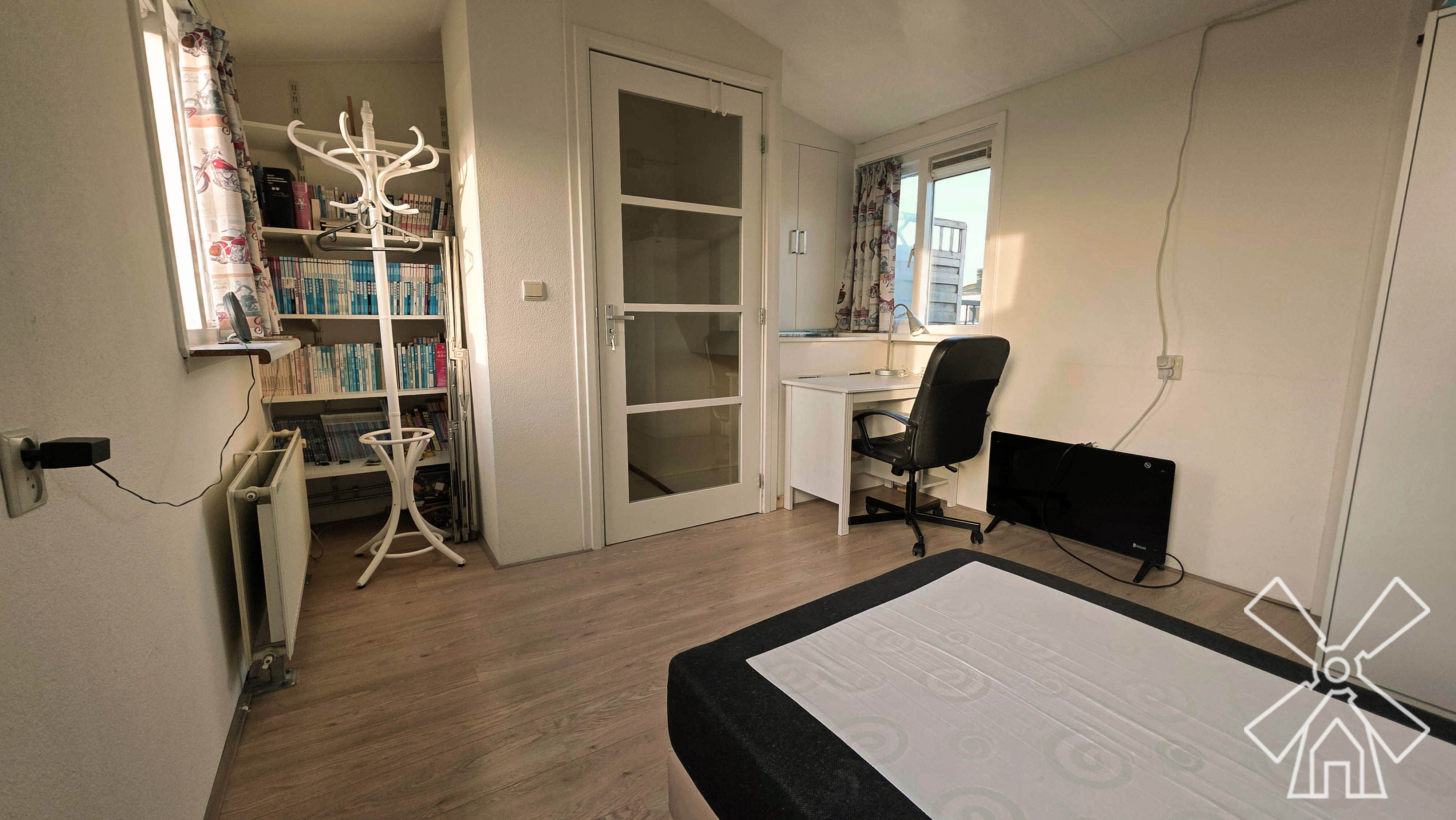 This accommodation includes a wood-patterned flooring and furnished with a bed, a desk with an office chair, a wardrobe, and storage furniture. Functional elements include a white coat rack near the bookshelf, a white radiator mounted on the far wall, and a black flat-panel heater placed on the floor. A white door featuring three glass panes serves as the central entrance to the space.